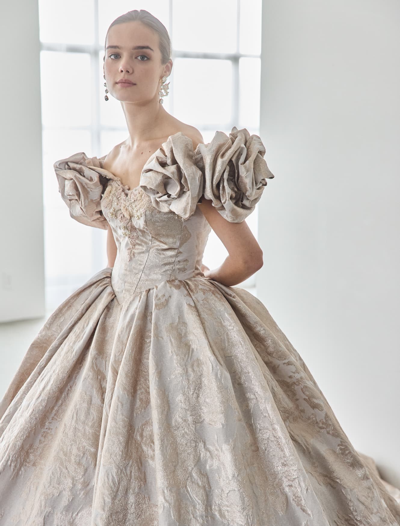 繊細なビーディングモチーフと同柄のグリッターモチーフで表現した大小のブーケをドレス全体に配したロマンティックデザインです。同系色の中に異なる色調のチュールを幾重にも重ねた「ユミ重ね」テクニックから生み出されるニュアンスカラーは必見です。アシンメトリーなストール風スリーブは上半身を華やかに魅せつつ、花嫁のどんな所作もエレガントに演出する効果も。