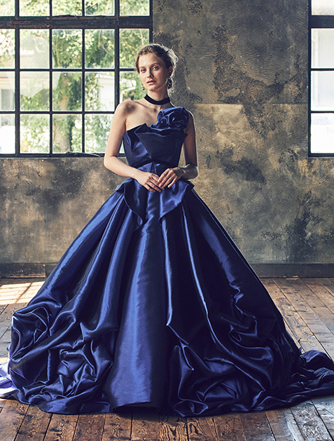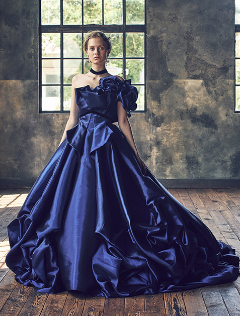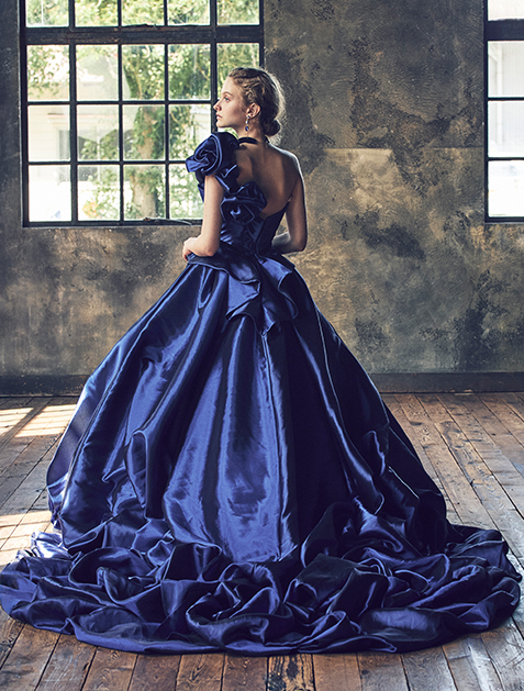 シルクミックスのオーガンジーをふんだんに使用し、ユミカツラの真骨頂でもあるタッキングテクニックで大輪の花を表現したモノマテリアルのカラードレスです。照明効果により創り出される陰影がまるで彫刻のような趣を添え、登場シーンをドラマティックに演出するフォトジェニックな1着です。着脱可能なワンショルダーは付けても外してもデコルテをエレガントに魅せてくれるのが嬉しいポイントです。