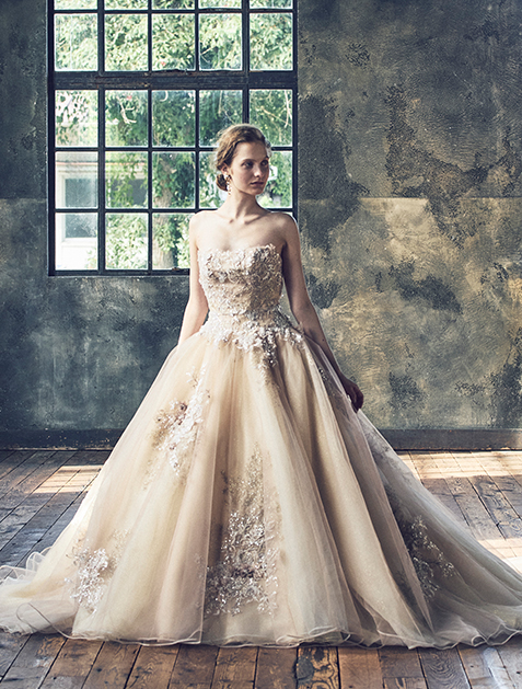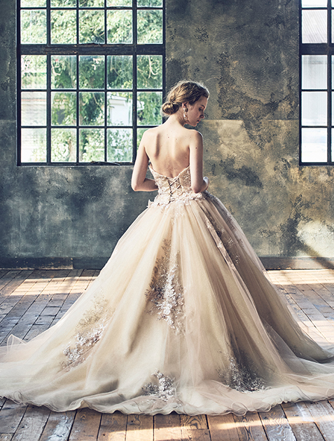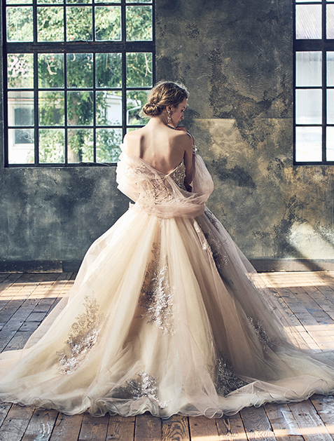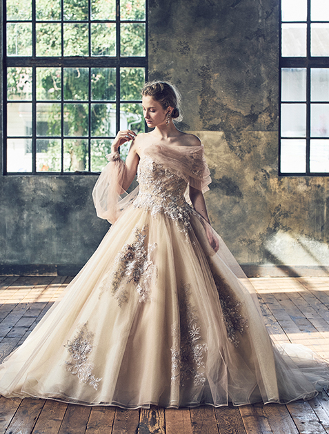 繊細なビーディングモチーフと同柄のグリッターモチーフで表現した大小のブーケをドレス全体に配したロマンティックなカラードレスです。同系色の中に異なる色調のチュールを幾重にも重ねた「ユミ重ね」テクニックから生み出されるニュアンスカラーが印象的な1着です。アシンメトリーなストール風スリーブは上半身を華やかに魅せつつ、花嫁のどんな所作もエレガントに演出してくれることでしょう。