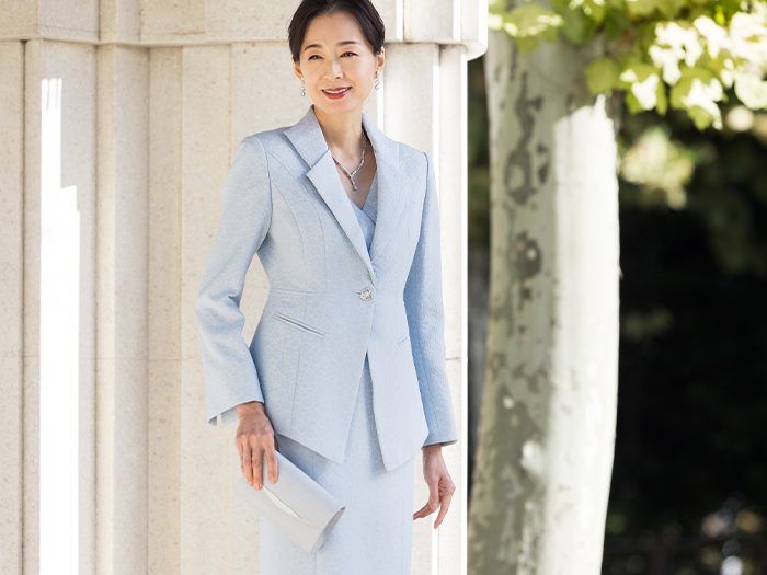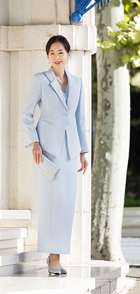正式な場にふさわしい洋装スタイルとしてはジャケット&ドレスのアンサンブルスタイルがお勧めですがユミカツラでは品格とエレガントさを兼ね備えたデザインを豊富に取り揃えております。また、お客様の体型にサイズが合う様に細かなお直しも徹底。TPOに合わせた小物合わせの提案も致します。男性はモーニングスタイルになりますが、同フロアーで取り扱いがあるので、ご一緒に並んでコーディネートできるのも魅力のひとつです。まずはどんなことでも気軽にご相談ください。