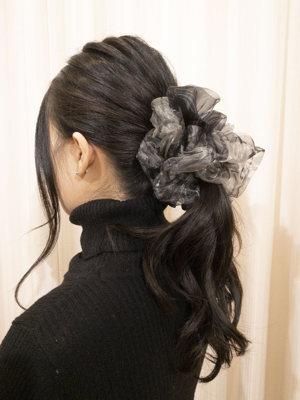 クチュールドレスでも使用されたYUMI YUZENオリジナルプリント素材を組み合わせたビックシュシュ。