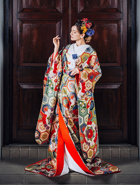 能衣装を手掛ける人間国宝(無形文化財保持者)の山口安次郎氏とYUMI KATSURAのコラボで誕生した他に類を見ない色打掛です。古来より伝わる能衣装のイメージを、亀甲紋と花紋というお祝いにふさわしい文様で、伝統美あふれる洗練された色使いと手機織で織り上げた、芸術品を思わせる逸品なので写真映えも美しくゲストのため息を誘うことでしょう。