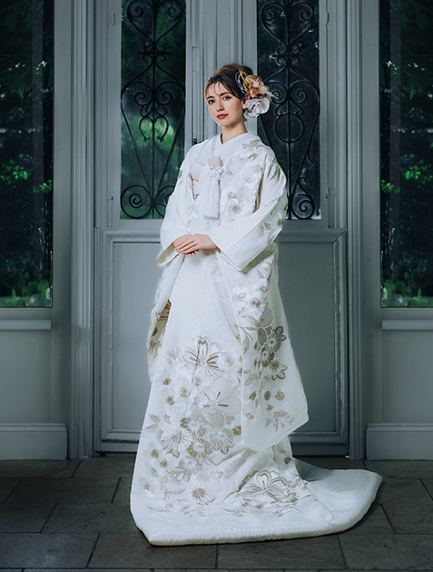 白無垢に咲き誇る桜の文様が艶やかに際立つよう、刺繡糸にベージュの濃淡を使用した横振り刺繍が遠目からも写真映えする逸品は、挙式時はもちろんのことドレスからのお色直しにも選ばれる人気のデザインです。桜の文様は「幸先の良い物事のはじまり」や「五穀豊穣」を表す縁起の良い柄ということもあり多くの方に愛されています。