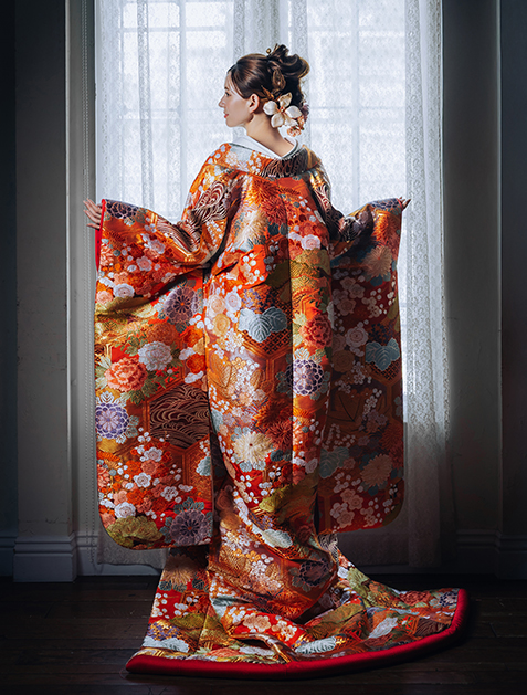 京都西陣における技術の最高峰である唐織の打掛です。長寿吉兆の象徴である亀の甲羅の形が由来となった亀甲柄を全面に配し、鳳凰が棲むとされる神聖な桐の花に松や梅など、縁起の良い吉祥柄を緻密に織り上げた逸品です。柄の一つ一つの色味が主張し過ぎないように色彩を落としつつ、アクセントに漆箔を使用することで深みが増し、「粋な品格まとう」慶びを感じていただける花嫁衣装に仕上げました。