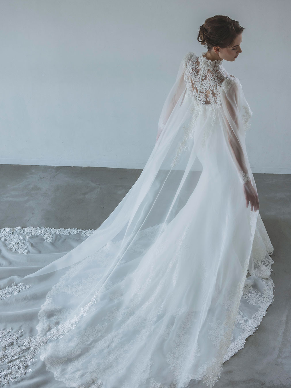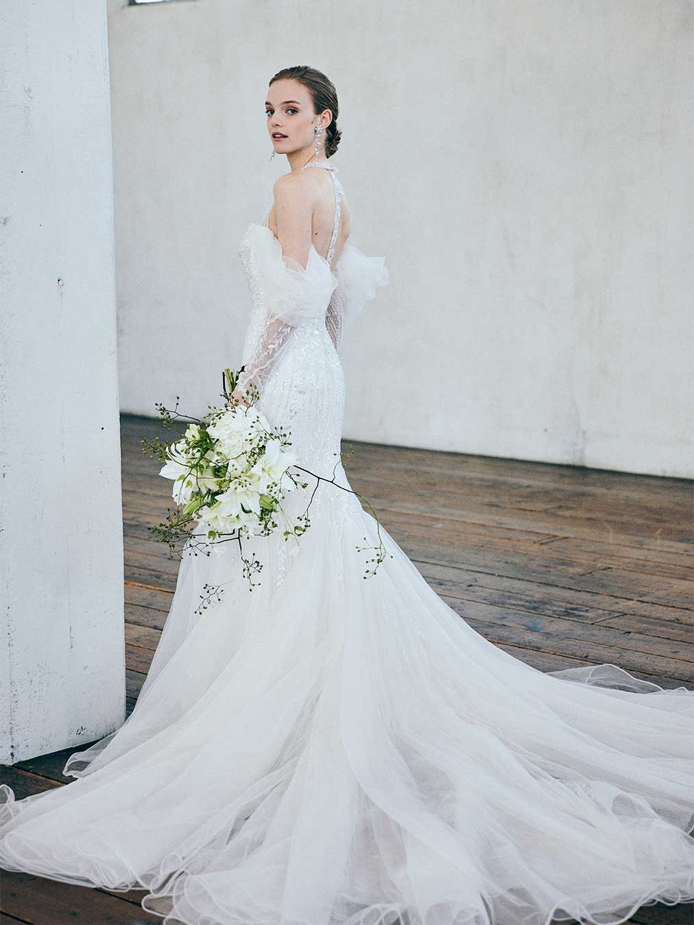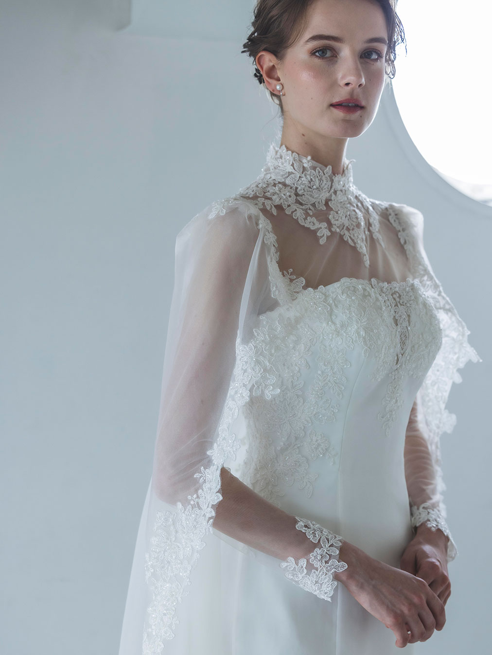 透明感の美しいチュール素材に、自然光のなかで優しく輝くビーディングレースや