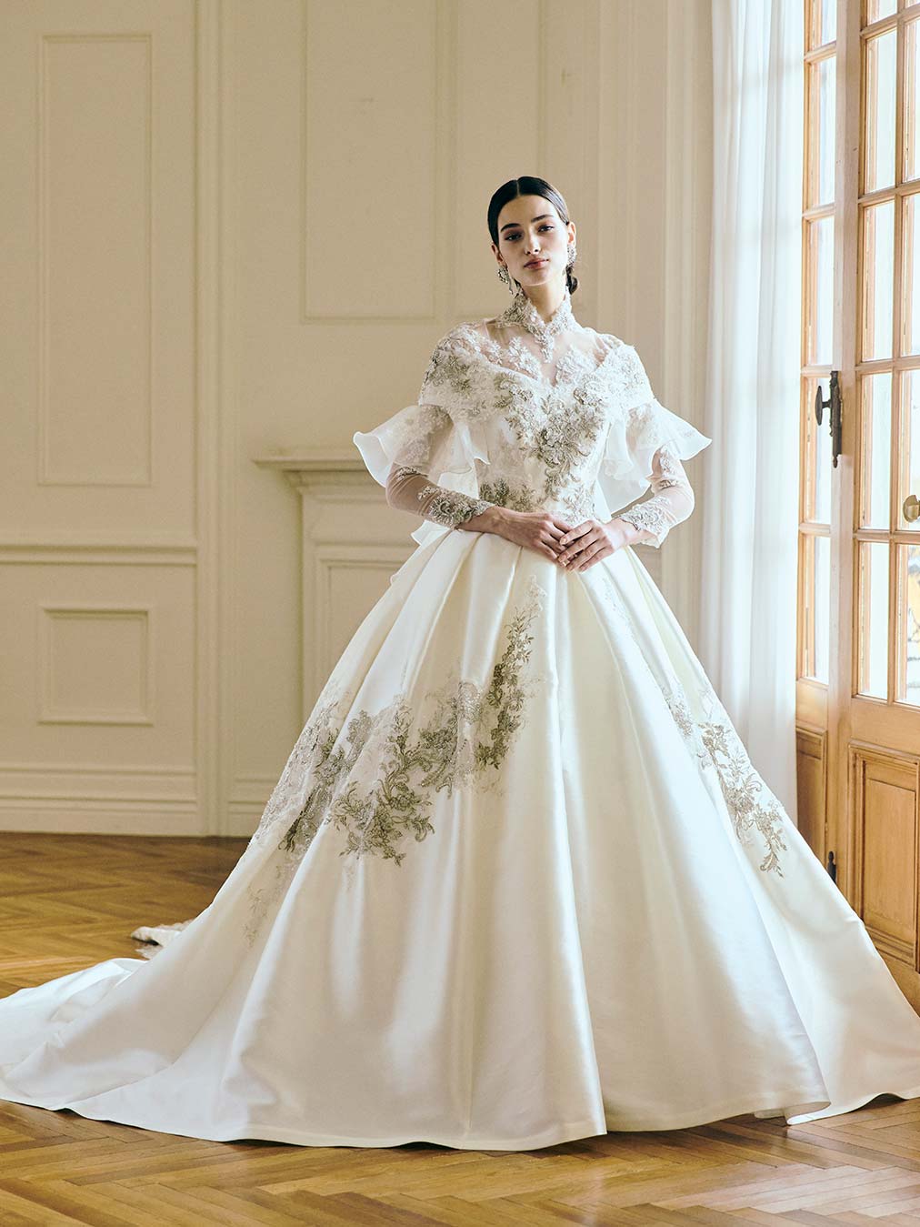 選び抜かれたエンブロイダリーレースとミカドシルクによって醸し出される高級感はラグジュアリーな披露宴会場にもぴったり。
