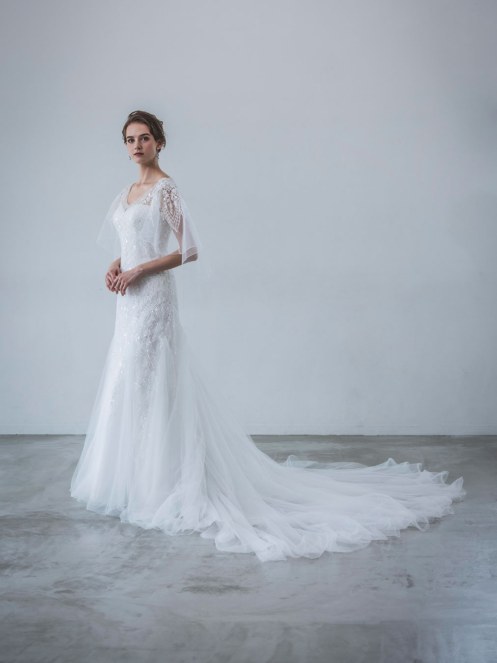 ビーディングレースと華やかなラメチュールを組み合わせた一着は、自然光の下で煌めき、花嫁様の透明感を引き立てます。