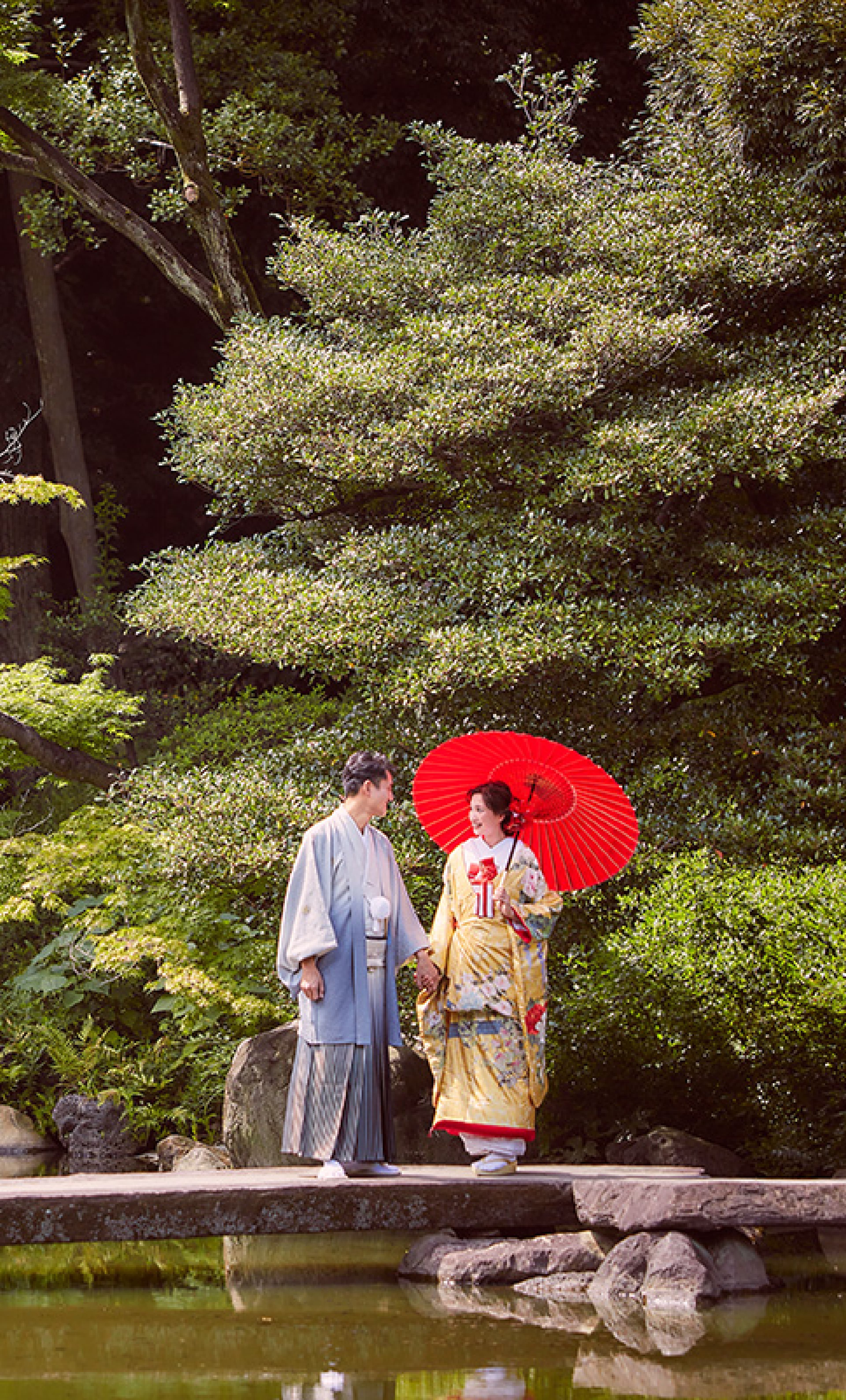大正ロマンが薫る石造りの洋館と、四季の花々が彩る庭園。重厚な建築美が映える洋館前では、まるでヨーロッパの貴族のような格調高い撮影を。春には約100種類のバラが咲き誇る洋風庭園で、花に囲まれた華やかなシーンが叶います。日本庭園の池や石橋を背景に和装で佇めば、水面に映る姿まで美しい一枚に。洋館の大階段や、バラのアーチの下でのロマンティックなカットなど、映画のワンシーンのような世界観が広がります。