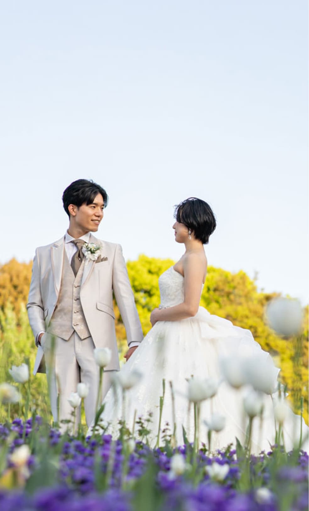 シンボルの大きな風車を背景に、ネモフィラ、ひまわり、コスモスと、季節の花々が咲き誇る広大な公園。まるで海外の田舎町を訪れたような、開放感あふれるナチュラルな撮影が叶います。四季折々の色彩がお二人の笑顔を優しく包み込み、飾らない「自然体な幸せ」を形に残せるのが魅力です。青空の下、風に揺れる花畑でお二人だけのピクニックのような楽しいひとときを。ペットとの撮影も可能で、家族全員での温かな思い出作りにも最適なスポットです。