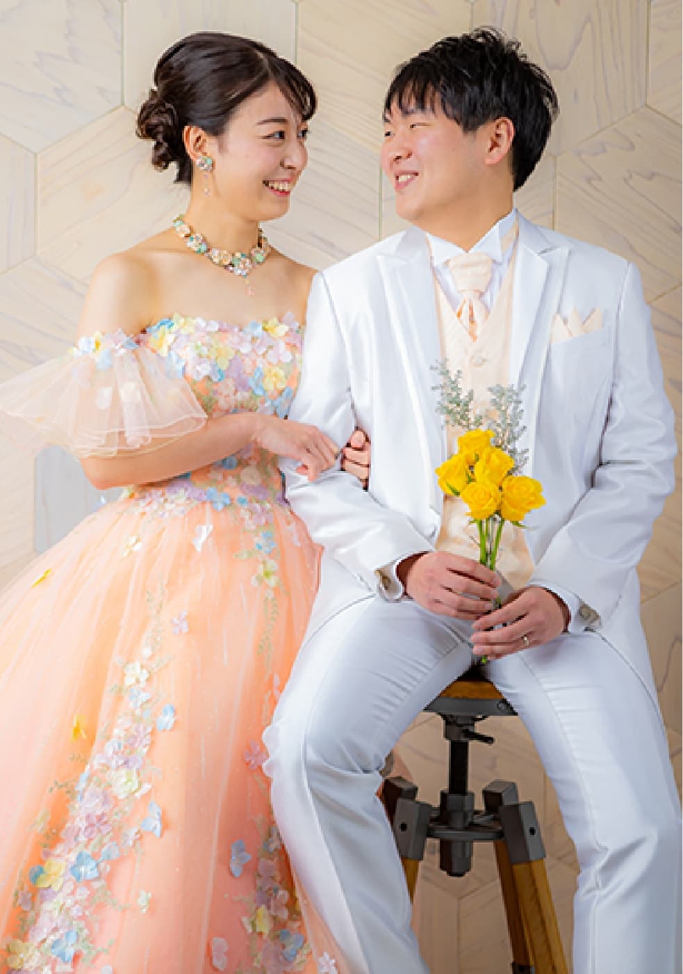 ・ピンク(オレンジ)のドレスは、初めてSNSで写真を見た時に一目惚れし、結婚式当日に着たいと思ったものの叶わなかったので、今回の撮影で着られて本当に嬉しかったです!何色もの生地が層になっていて、ピンクとオレンジの間のような色味は他のどこのドレスショップでも見つからない素敵な色味でした。ふわふわ広がる裾が本当に可愛くてずっと着ていたかったです。普通のピンクだと自分には可愛らしすぎるので敬遠していましたが、このドレスはいわゆるオレンジベースの肌の私でも着られました。