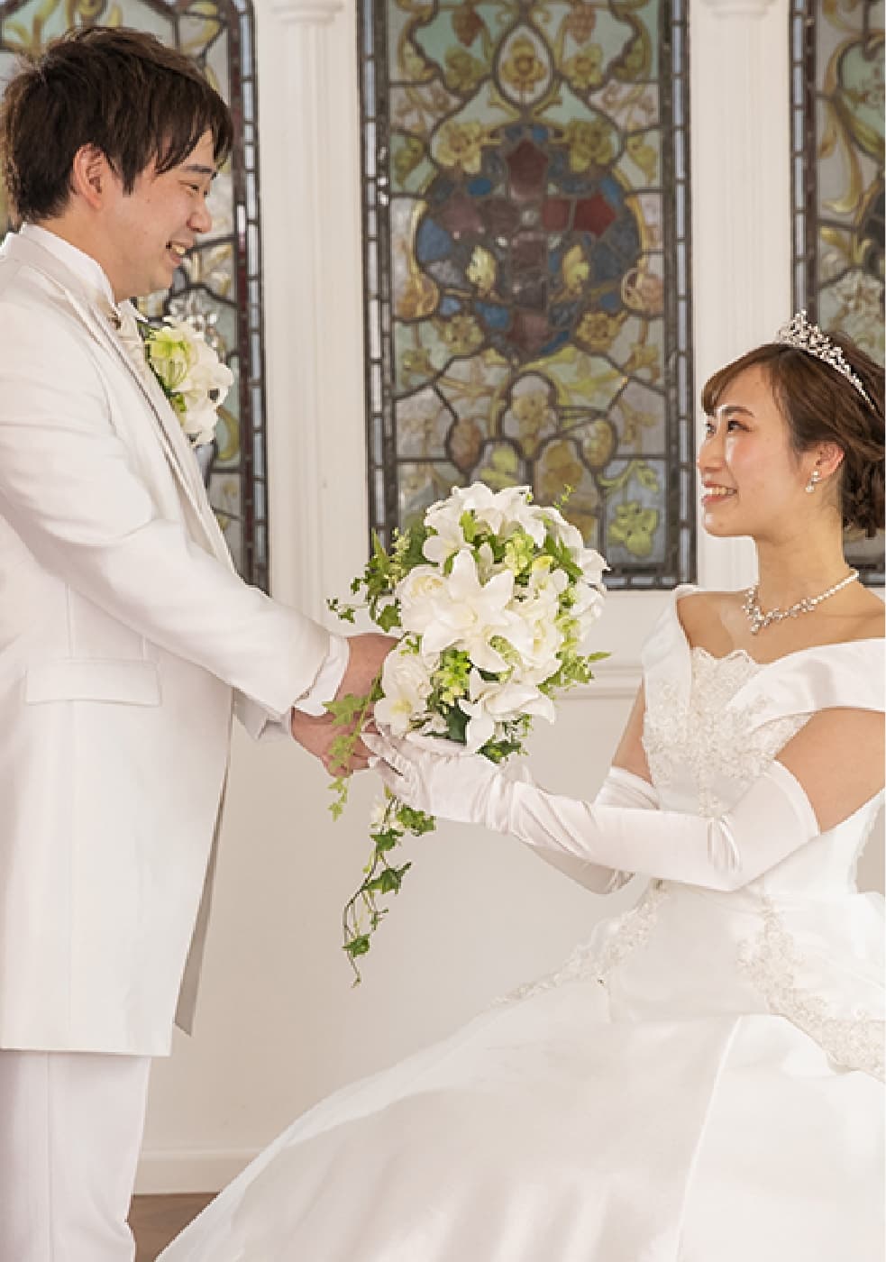 ・挙式用途は異なるタイプのウェディングドレスとカラードレスでご撮影頂きました。撮影開始時は少し緊張気味でしたが、お二人で向かい合ってのショット等は特に素敵な笑顔で、拝見しているだけで幸せを分けて頂けました。