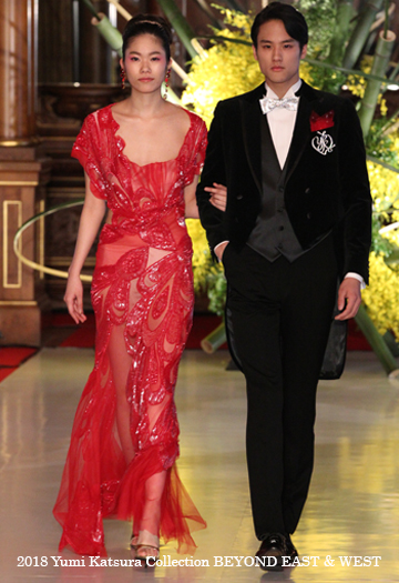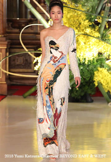 今回は「BEYOND EAST&WEST(東洋と西洋を超えて)」をテーマに、伝統工芸技術を駆使して制作した着物やドレスなど62点をフロアショー形式で紹介。更に名工による手描き友禅と手刺繍の実演やこうした技術で制作された作品展示を通し「日本の伝統工芸技術の革新と創造」を世界に発信することが出来ました。また、このイベントは日本の伝統工芸技術や日本文化を取り入れた服飾文化における「東西の融合」のアピールを目的としたので、同じく西洋建築の中に日本の粋を結集させた迎賓館赤坂離宮を舞台とすることで、両者による高いシナジー効果と、大きな訴求力が発揮されたものと思います。なお、迎賓館赤坂離宮がファッションに関するイベントの会場となったのは今回が初めてのことでした。