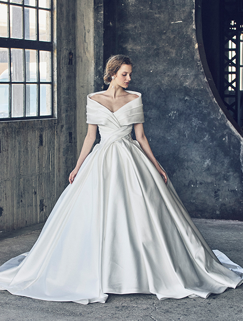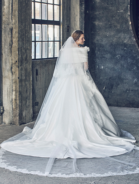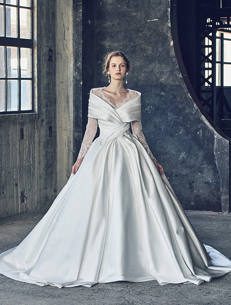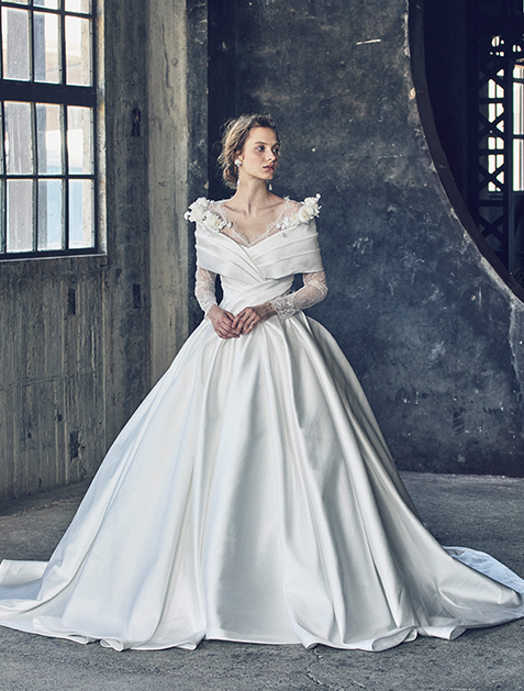 上質な光沢感が魅力のシルクミックスミカドのモノマテリアルドレスは、ドレープテクニックを駆使しほっそりウエストを強調してくれる嬉しいデザイン。上半身にはシャンテリー風のレースブラウス、更にハンドメイドのクチュールフラワーでデコルテを華やかに飾りつつ、気になる二の腕をスッキリ見せる効果も。2WAYタイプなので本番時とフォト撮影でのイメージチェンジが楽しめます。