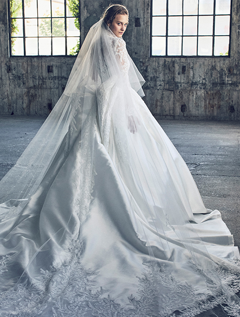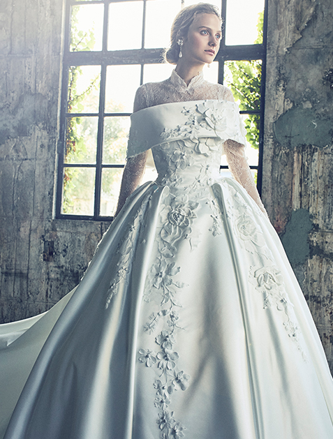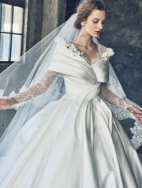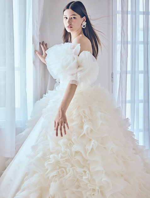 憧れのロイヤルウェディングを彷彿とさせる高貴な雰囲気をまとったモノマテリアルデザインのドレスは、トレンドでもあ …