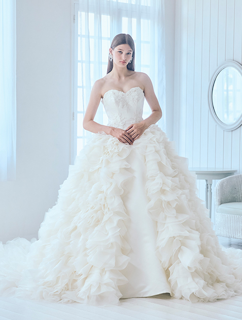 トレンドのフリルボリュームスカートを施した2way スタイルのドレスです。華やかなオーバースカートはフロントを開けたエレガントなスタイルと、フルカバーでキュートなイメージへとコーディネートチェンジが可能。更に全て取り外すとシンプルなサテンドレスへと大変身!。お袖にもフリルがついてオシャレと二の腕カバーが一緒に叶う魅力的なウェディングドレスです。